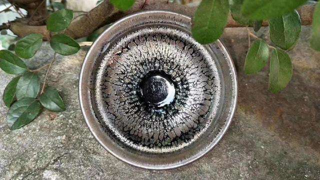 关于曜变盏的欣赏,最好是在阳光下有光线的条件下欣赏,才能够尽显它的玄妙瑰奇之美。在阳光下,阳光为复合光,有七种颜色,照耀在曜变斑纹之上,便会折射出变幻无穷的异彩,而且随着观赏的角度而变化,曜变盏非常难得,极其珍贵。