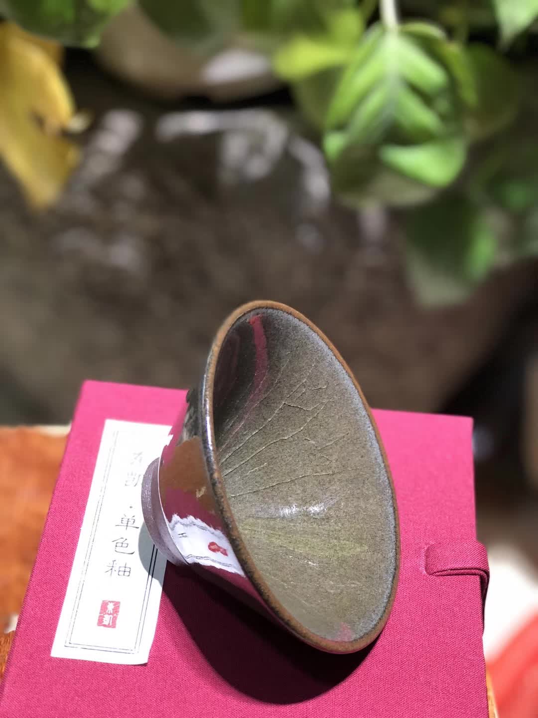 王东凯制 单色釉 茶末绿 自然开片纹理 斗笠型